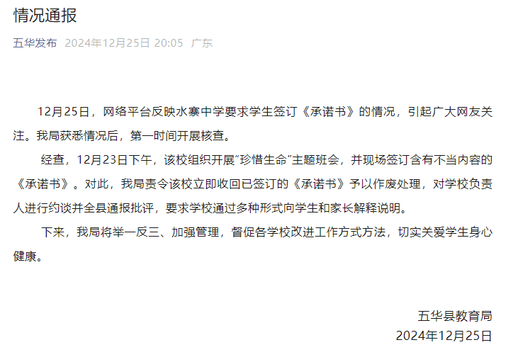 · 25日,网络站点渠道反映水寨中学要求学生签定《许诺书》的状况,引发热议。广东五华县教育局通报↓