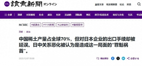 日本最忧虑的事,好像发生了。12月7日,日媒《读卖新闻》征引多名日本政府官员的话称,现在日方正在评价这是否与中日联系恶化的现状有关。日媒说到,4日我国商务部曾再次批判高市早苗的涉台过错言辞,并着重